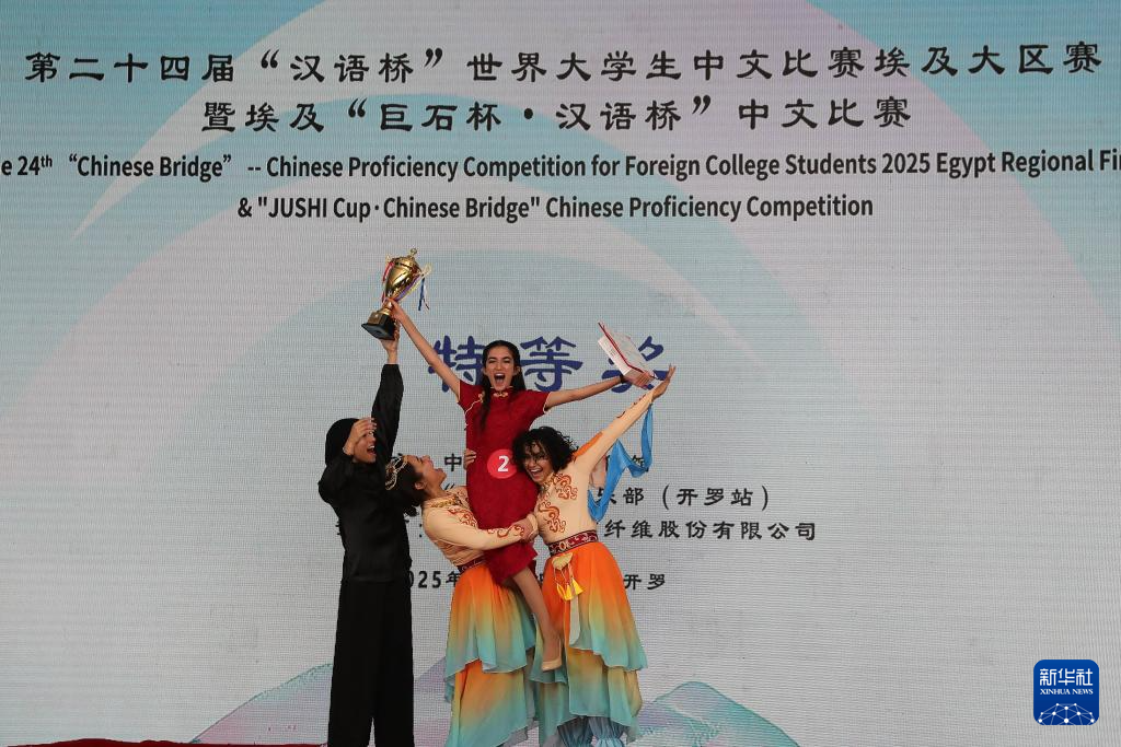 5月17日,来自开罗大学的奥拉·谢里夫获得特等奖后和同学庆祝。新华社记者 王东震 摄