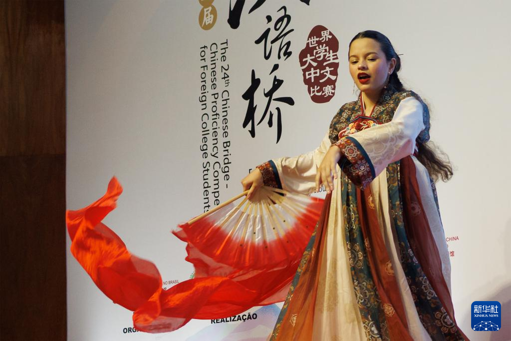 5月17日,在巴西里约热内卢,一名大学生参赛选手在比赛中进行才艺展示。新华社发(克劳迪娅·马尔提尼摄)