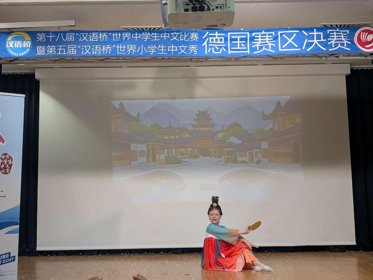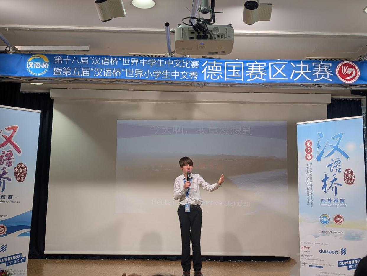 人民网柏林5月25日电(记者郭梓云)由中外语言交流合作中心主办,中国驻德国大使馆协办,鲁尔都市孔子学院承办的第十八届“汉语桥”世界中学生中文比赛暨第五届“汉语桥”世界小学生中文秀德国赛区决赛于5月24日在杜伊斯堡市圆满落幕。来自全德各地中小学、孔子学院推荐的22名中小学选手同台竞技,以流利的中文表达和精湛的中华才艺,展现了对中国语言与文化的热爱。百余名专家、汉语教师、孔院学生、汉语爱好者现场观摩了比赛。