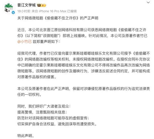 本次纠纷所涉及的是即将上线播映的网络微短剧《偷偷藏不住之许你》。晋江文学城于24日晚发布声明称:经我司代理,作者竹已仅曾向霍尔果斯哇唧唧哇娱乐文化有限公司授予《偷偷藏不住》的网络剧改编权等相关权利,未授权网络微短剧改编权。