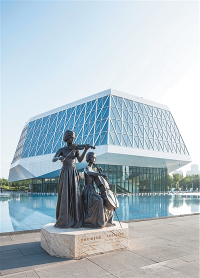 图为哈尔滨音乐厅及国际著名音乐家勋菲尔德姐妹铜像。李野摄