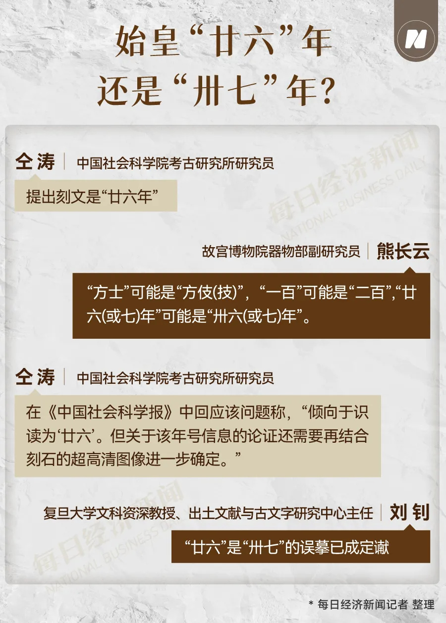 6月8日,仝涛提出刻文是“廿六年”(即秦始皇二十六年,公元前221年)。此纪年与《史记》记载的秦始皇活动轨迹存在矛盾——公元前221年秦刚统一六国,秦始皇尚未大规模派遣方士求仙,且“采药昆仑” 的人应该是前一年就出发了,其行为缺乏历史背景支撑,引发广泛质疑。