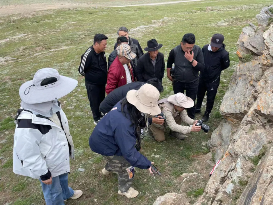 2023年7月4日 华旦等人陪同仝涛(前排蹲下拍照者)考察“昆仑石刻” 图片来源:华旦 摄