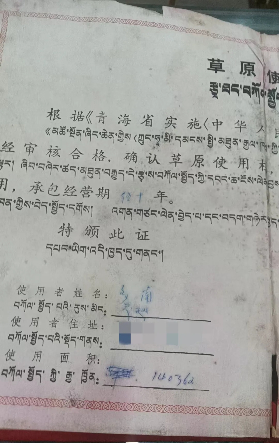 记者了解到,2001年11月,多杰南杰与兄弟姐妹的草场正式分开。据其介绍,他独自拿到了包含“昆仑石刻”在内的14万亩草场承包证。2011年至今,这块草场交由多杰南杰的儿子、侄子两户人使用。
