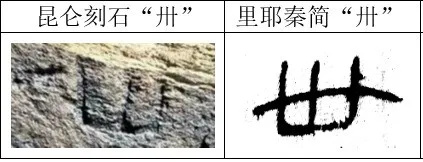 目前多位学者倾向将刻文中的纪年释读为“卅七”年。刘钊在6月30日的文中表示,“廿六”是“卅七”的误摹,并将昆仑刻石中的“卅”和“七”字与里耶秦简“卅”和“七”字进行对比。