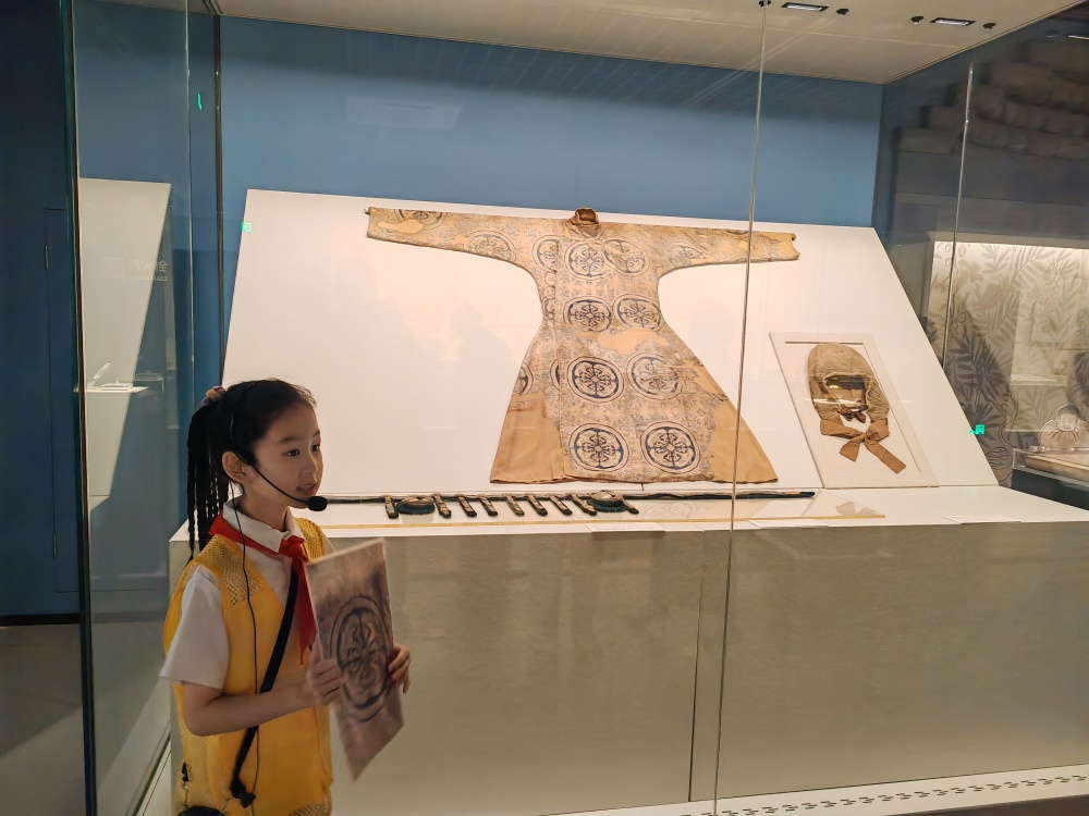 11日下午,小学生志愿讲解员在中国丝绸博物馆的“碧色万里——10-12世纪的草原丝绸之路”主题大展向观众介绍展出的辽代服饰。新华社记者 冯源 摄