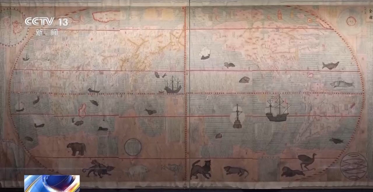 展柜中,《坤舆万国全图》彩色摹绘本静静铺展,细腻的线条勾勒出椭圆形的世界轮廓,打破了“天圆地方”认知。
