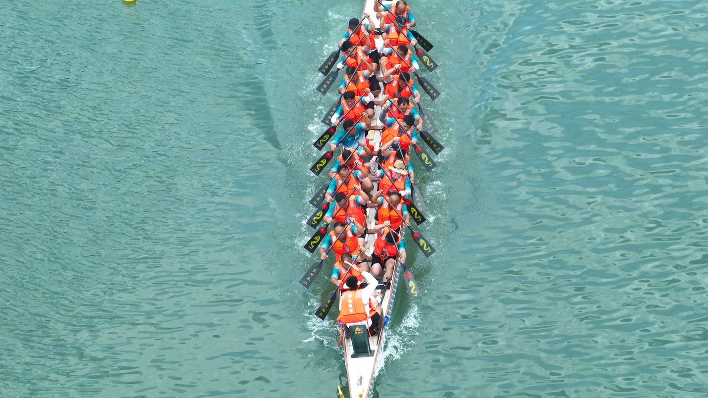 随着发令枪响,精心装扮的龙舟如离弦之箭劈波斩浪。船头鼓手槌落如雨,急促的鼓点似惊雷滚动,桨手们齐声呼喝,木桨整齐划一,溅起雪白浪花,将整场活动氛围推向高潮。