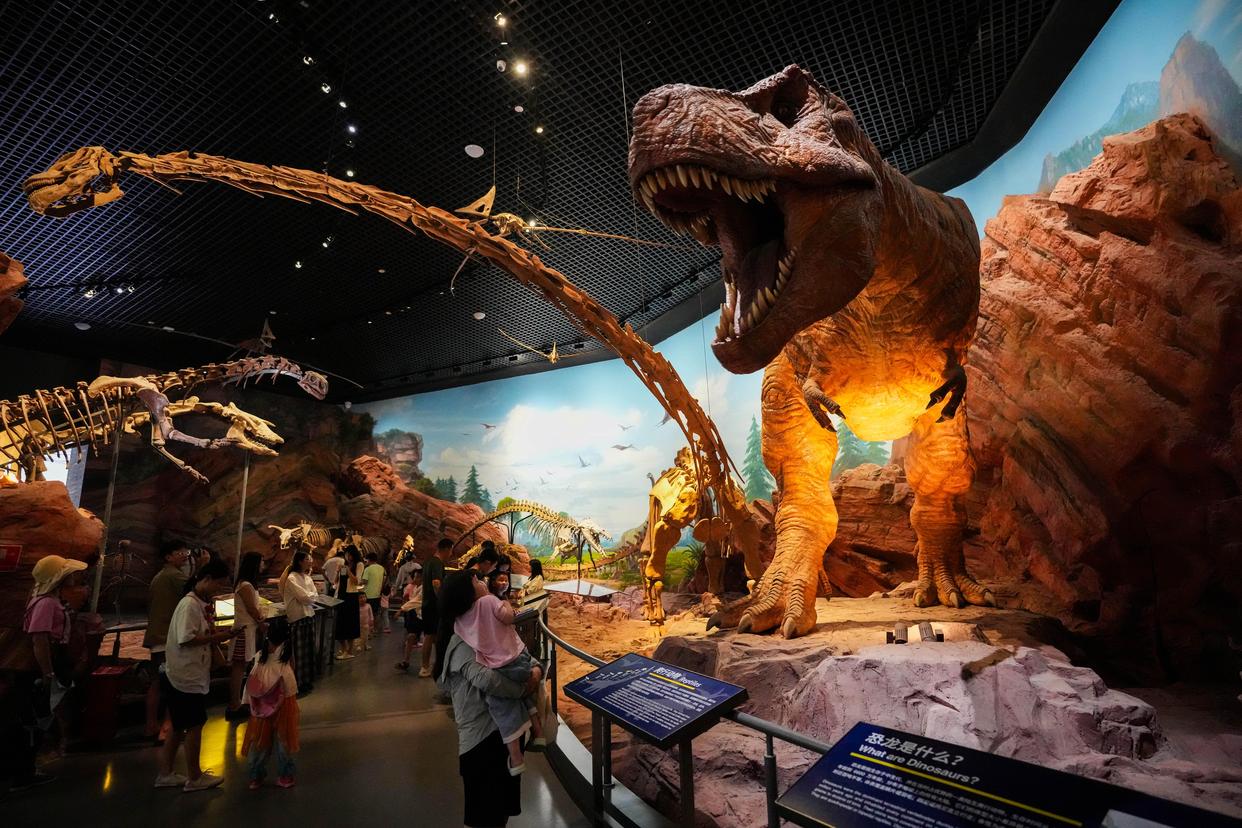 7月15日,游客在澄江化石地世界自然遗产博物馆参观恐龙模型及化石。新华社记者 陈欣波 摄