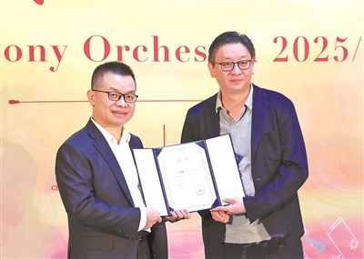中国交响乐团党委书记周宇(左)为著名小提琴家陆威颁发客座首席聘书。摄影/罗维