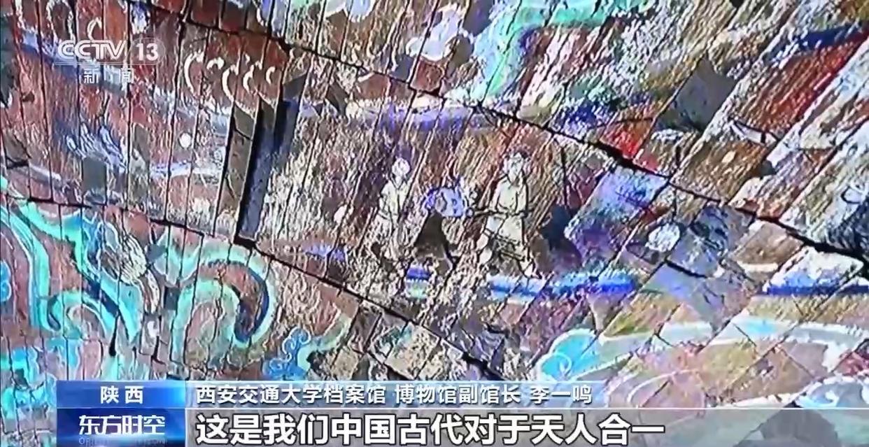 西安交通大学档案馆 博物馆副馆长 李一鸣:大家可以通过VR来感受这个西汉壁画墓。在整个绘画的中心是一个太阳和一个月亮。我们在古代太阳是以三足金乌作为代表,而月亮是以蟾蜍和玉兔作为代表,围绕它就是28星宿,分为东西南北4个方向,每个方向各有7宿。南方朱雀下面有很多云气,还画了很多的动物,它是完整图画式的星图来记载。这个记载就和《史记·天官书》上关于28星的描述是完全一致的,这是我们中国古代对于天人合一思想的表现。