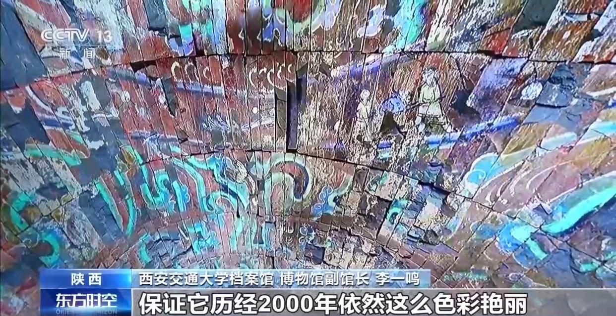 西安交通大学档案馆 博物馆副馆长 李一鸣:绿色它来自叫作松石的一种颜料,有点发光的紫色其实是多种颜料的混合物。就是用这些矿物质颜料,保证它历经2000年依然色彩艳丽。这个绘画是先涂色而绘后勾线,这和现在中国画的先白描而再全色的方式,完全是相反的。