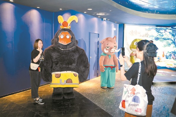 从走出轨交徐家汇站的那一刻起,“浪浪山”主题灯箱便接连映入眼帘,悄然揭开这个奇幻宇宙的序幕;美罗城商场球幕上的“小猪妖”头像和“这条路走对了”的标语,引人驻足眺望;走进“大王洞”观影,挑选三五周边玩偶、精美文创产品,在360°环形剧场听一场“浪浪山开放麦”,在“猪妈妈茶水站”来一杯饮料……这趟沉浸式体验丰富而圆满。