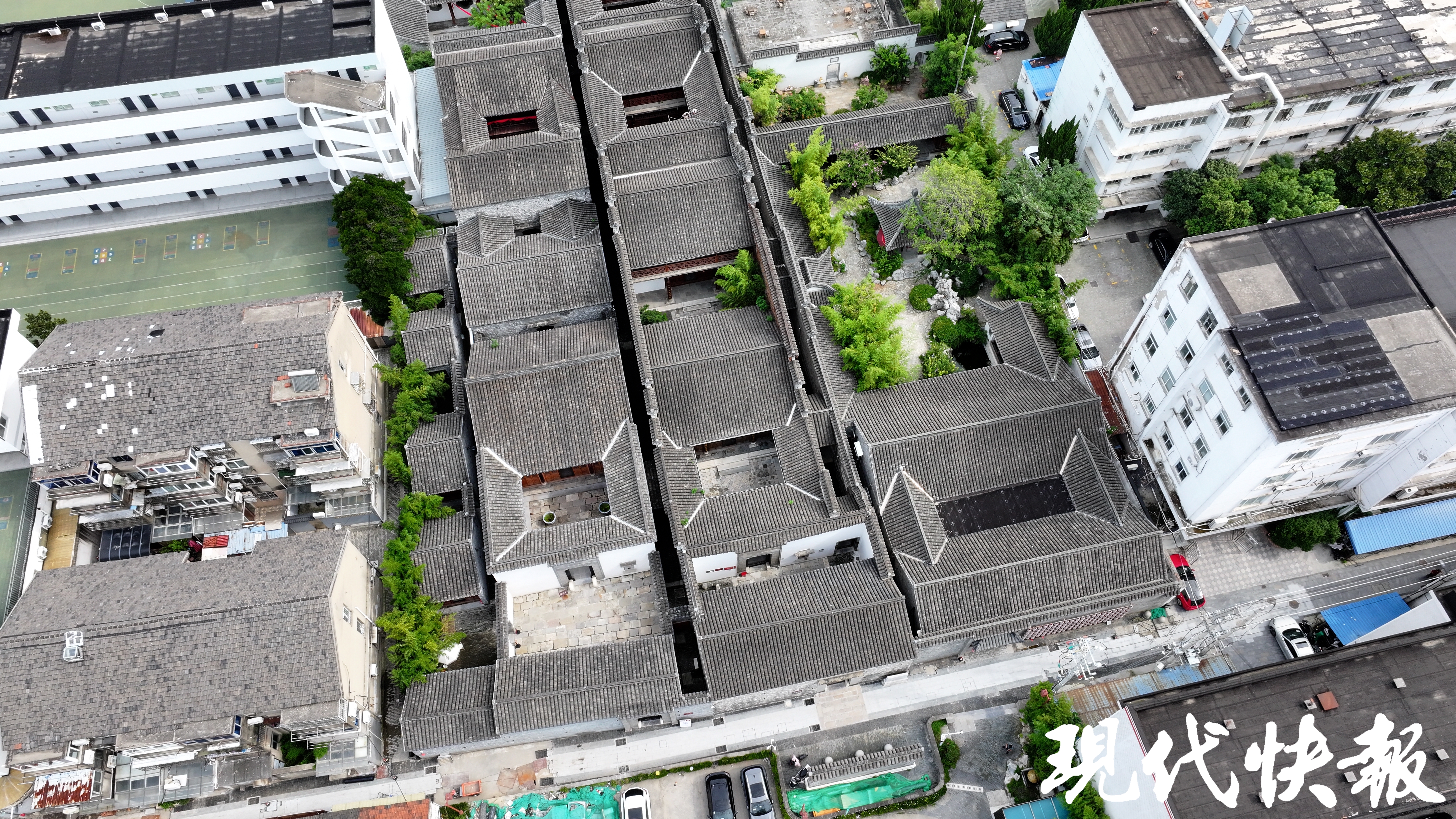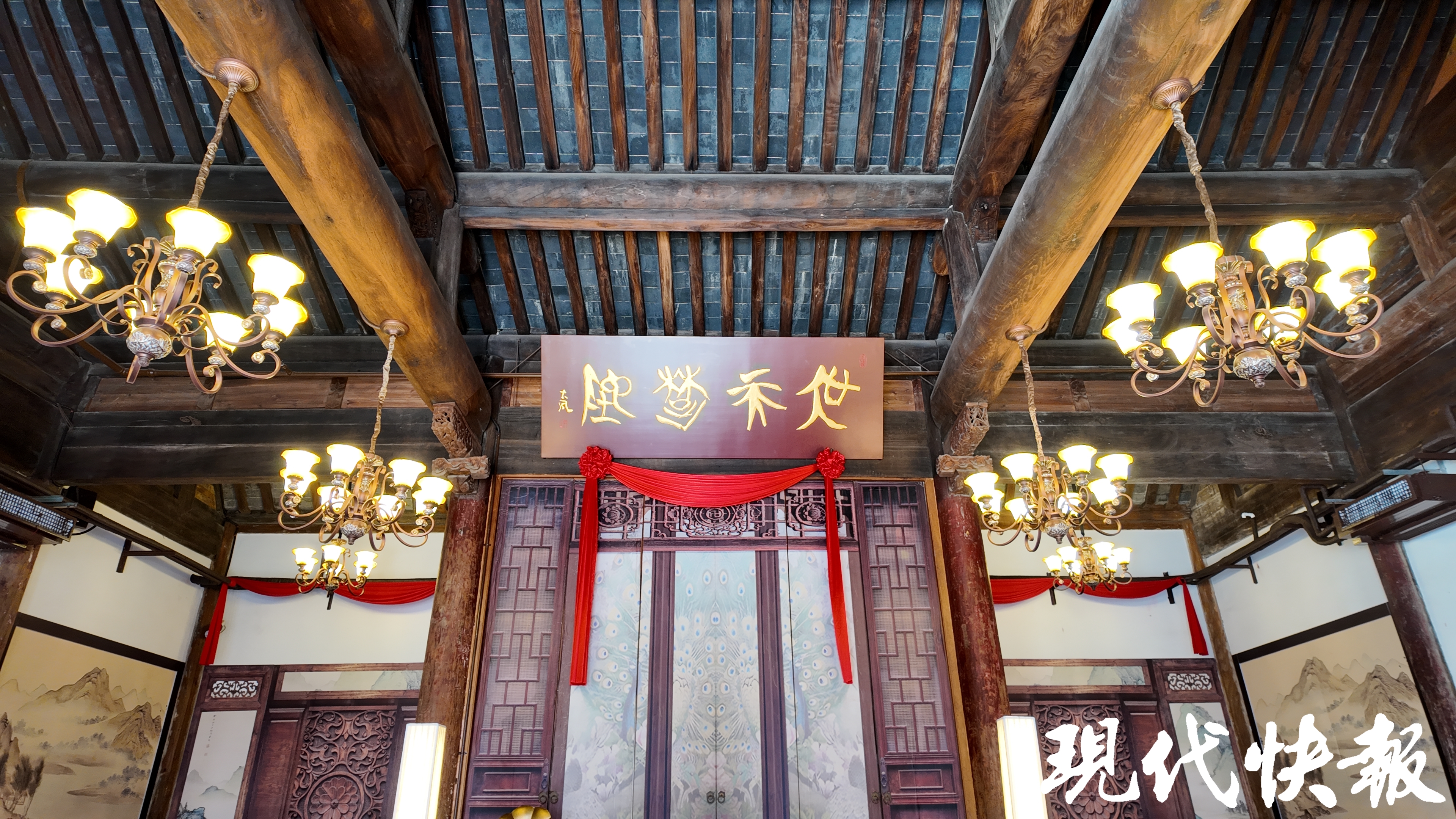 8月8日,现代快报记者来到刚开放的湖北会馆,步入楠木大厅,一幅“吴天楚地”的匾额映入眼帘。这座由湖北商人筹资创建的同乡会馆,始建于清朝同治年间。会馆原占地千余平方米,由东、西两路组群布局,房屋数十间。东纵轴线房屋原有前后共五进,有门厅、照厅、正厅、厢廊、后宅,楼屋,西轴线住宅原有前后三进和院落。民国二十三年(1934),会馆曾一度遭盗卖,后由杨国卿通知仪征二十圩及镇江同乡进行诉讼,于1935年部分修缮,改由湖北籍吴云三负责管理湖北会馆日常事宜。新中国成立后,还剩老屋二十三间四厢,建筑面积672.46平方米。后因历史原因,仅存东路主房楠木构架正厅和串楼(又名念佛楼)。
