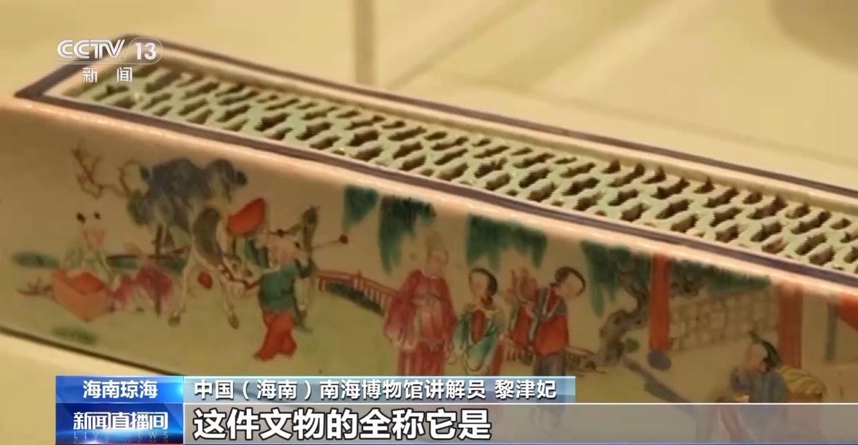 中国(海南)南海博物馆讲解员 黎津妃:这个蟋蟀筒的全称它是青花粉彩人物镂空龙纹蟋蟀筒,斗蟋蟀也是古代流行的一种民间娱乐活动。