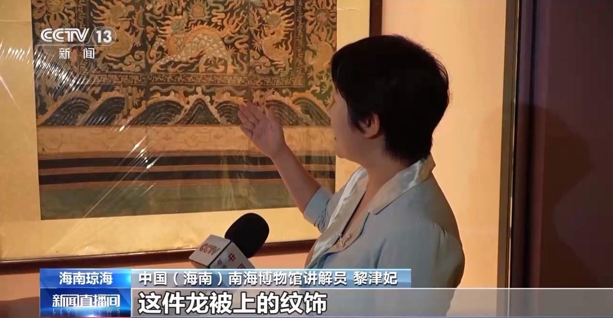 中国(海南)南海博物馆讲解员 黎津妃:这件龙被上的纹饰由黄、白、蓝、三色线织绣而成,龙被是黎族织锦中集纺、染、织、绣四大工艺中难度最大的一个织锦艺术精品。