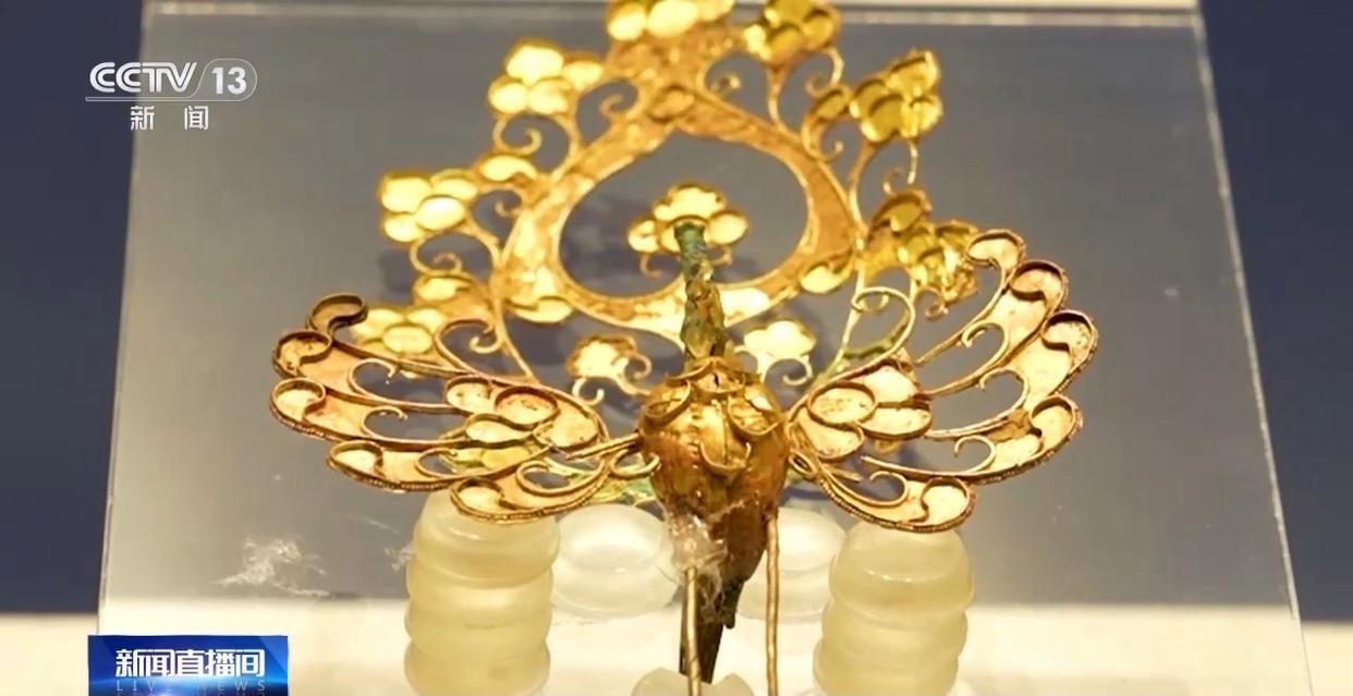 白居易在《长恨歌》中写道:云鬓花颜金步摇,芙蓉帐暖度春宵。这件同样来自陕西历史博物馆的凤形包金银步摇就是诗中提到的金步摇,行走时摇曳生姿,故称“步摇”。