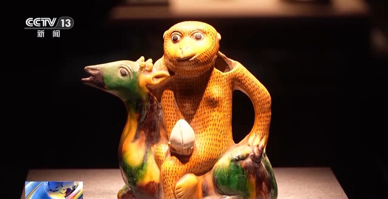 在这个展览当中,一件素三彩的执壶是个“显眼包”,可以看到一只憨态可掬的猴子手上还托了一颗桃,坐在了一匹马上,这件展品有一个非常好的寓意,叫“马上封侯”。
