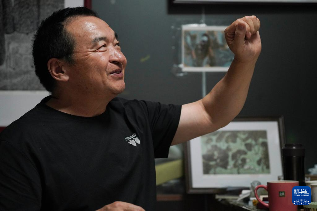 8月10日,在内蒙古扎鲁特旗版画院,画家齐同跃介绍自己正在创作的版画作品。