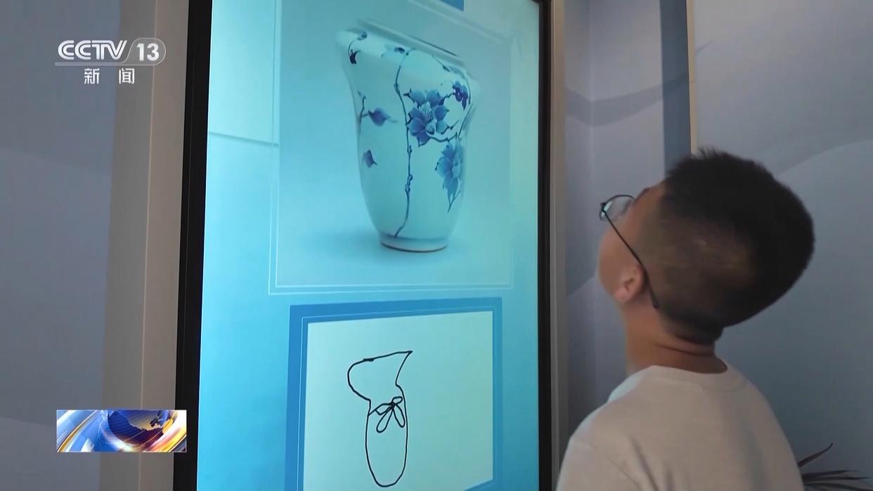 在展厅里,观众不仅能近距离欣赏精美的青花器物,还能在互动中感受蓝白交织的中式美学。在展览出口处的触摸屏,观众只需绘制出简单的轮廓,人工智能系统就会以此为基础,生成一件独一无二的青花瓷,让参观体验更富趣味。
