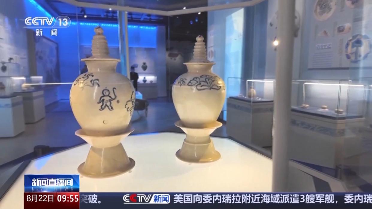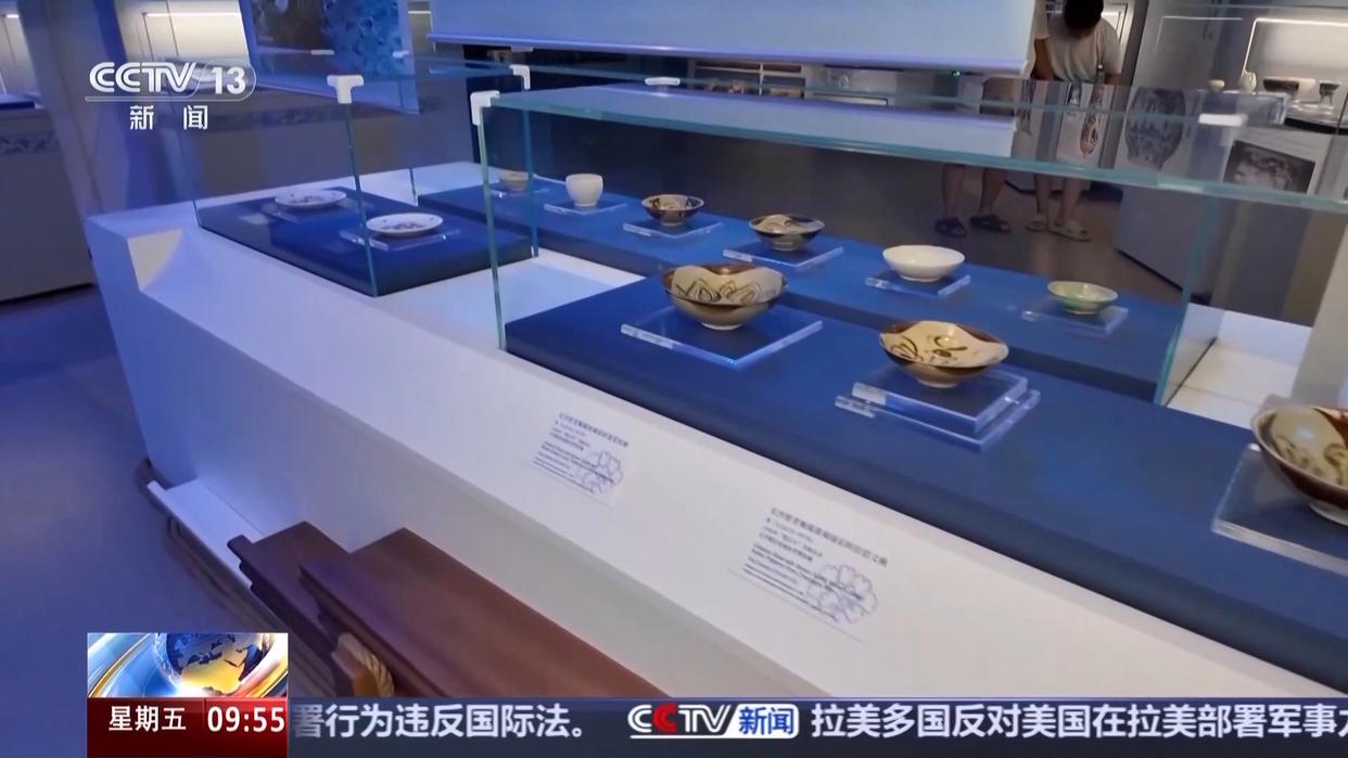 总台记者 艾泽乐:展厅中专设了一块船型展示区域,专门讲述唐青花出海的故事。1998年,德国打捞公司在印尼海域发现了一艘唐代沉船,船上装载的67000多件器物中,有3件完好无损的唐代青花瓷盘。