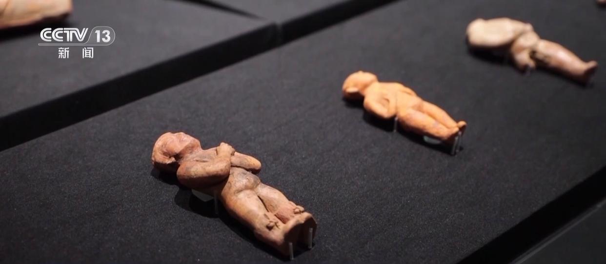 工作人员介绍,女神庙代表的是祖先崇拜。展览选取了不同材质和不同年代的人像,它们有一种非常统一的手势,或者是双手交叠放在胸前,或者是放在腹部。这些人像,代表着西辽河流域祖先崇拜的传承。