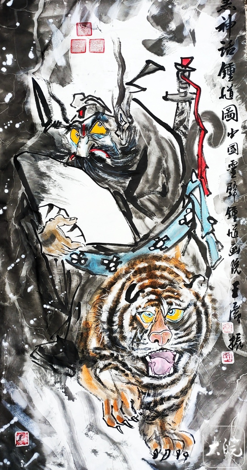针对画中出现的虎、鞋、剑等元素,王广振表示,这些元素也与灵璧钟馗画有异曲同工之妙。他介绍,灵璧钟馗画通常有几个代表性元素,分别是剑(或宝扇)、玉带和黑鞋,“它没有完全复刻灵璧钟馗画的形态,而是在五六成灵璧元素的基础上,加入了符合当下视觉审美的创新表达,这很难得。”