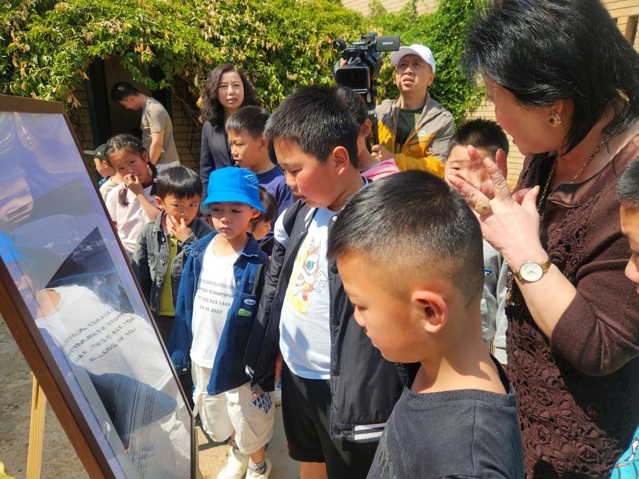 中文学校师生在照片展现场 。非洲华文教育基金会中文学校供图