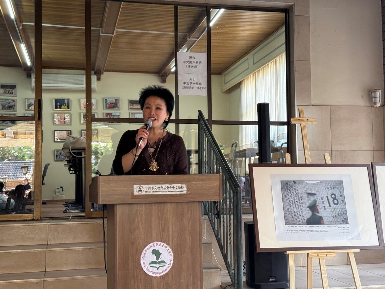 非洲华文教育基金会主席韩芳致词 。非洲华文教育基金会中文学校供图