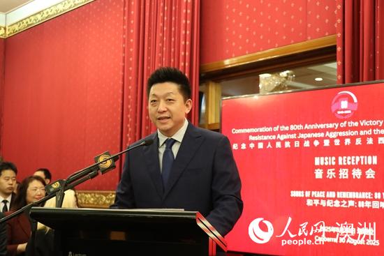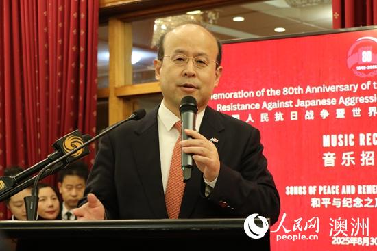 人民网堪培拉9月1日电 8月30日,“和平与纪念之声:80年回响”—纪念中国人民抗日战争暨世界反法西斯战争胜利80周年音乐招待会在驻澳大利亚使馆举办。中国驻澳大使肖千,澳联邦参议员休布里奇、各界人士,各驻澳使团、华侨华人、留学生代表近400人出席。