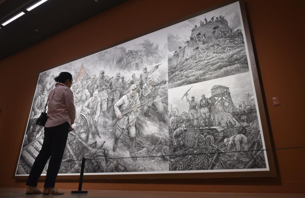 8月25日,参观者在中国美术馆观看展出作品《百团大战》。