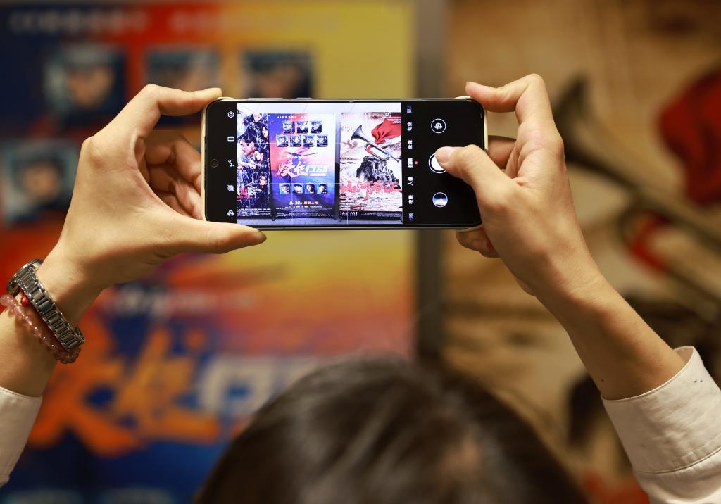 8月31日,在湖北省武汉市江岸区一家影城,观众拍摄近期上映的电影海报。新华社发(赵军摄)
