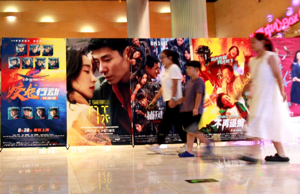 8月30日,在山东省临沂市平邑县时代国际影城,观众从电影宣传海报前走过。新华社发 (武纪全摄)