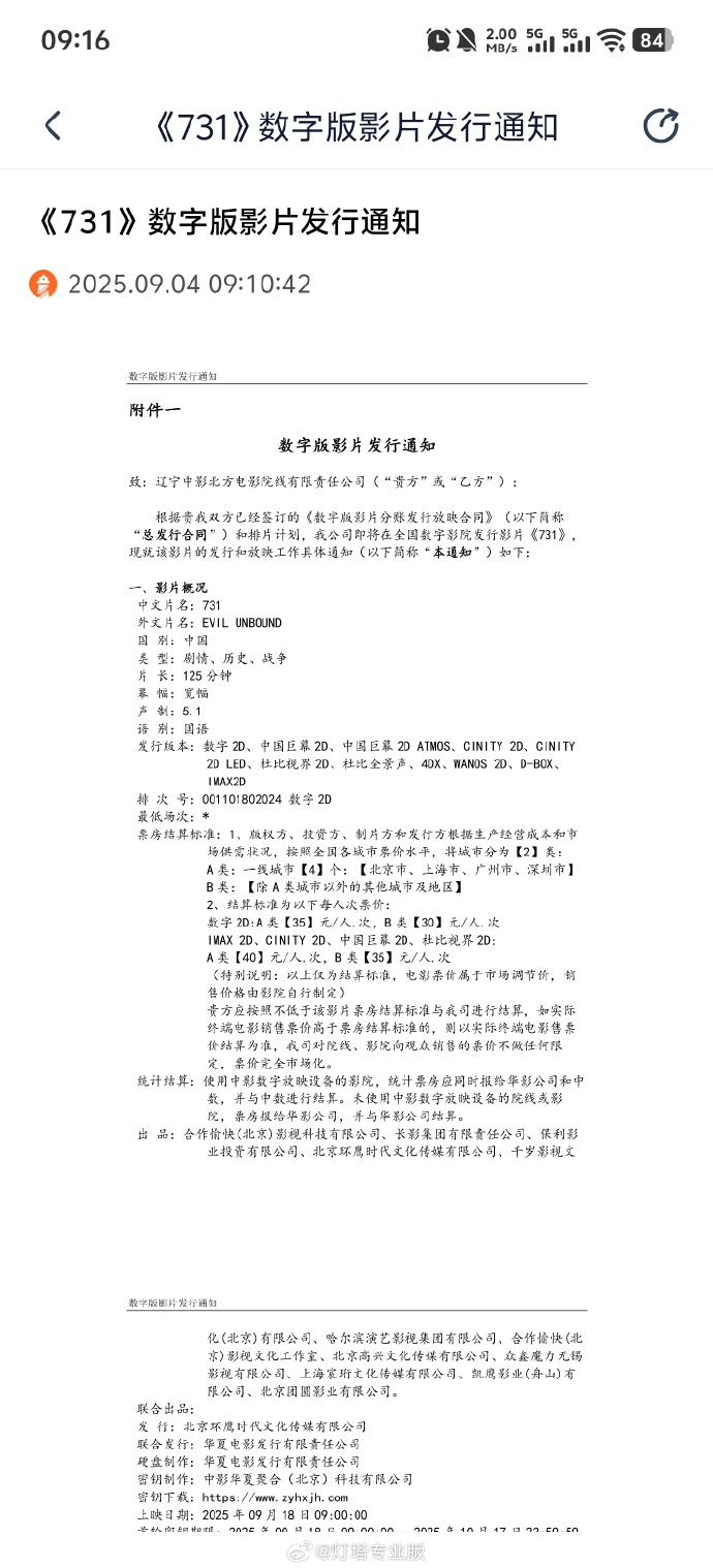 据灯塔专业版,影片《731》发行通知出炉,片长125分钟,9月18日上映。