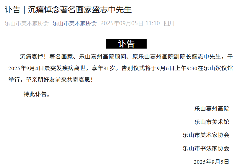 著名画家、乐山嘉州画院顾问、原乐山嘉州画院副院长盛志中先生,于2025年9月4日晨突发疾病离世,享年81岁。告别仪式将于9月6日上午9:30在乐山殡仪馆举行,望亲朋好友前来共寄哀思!