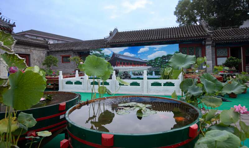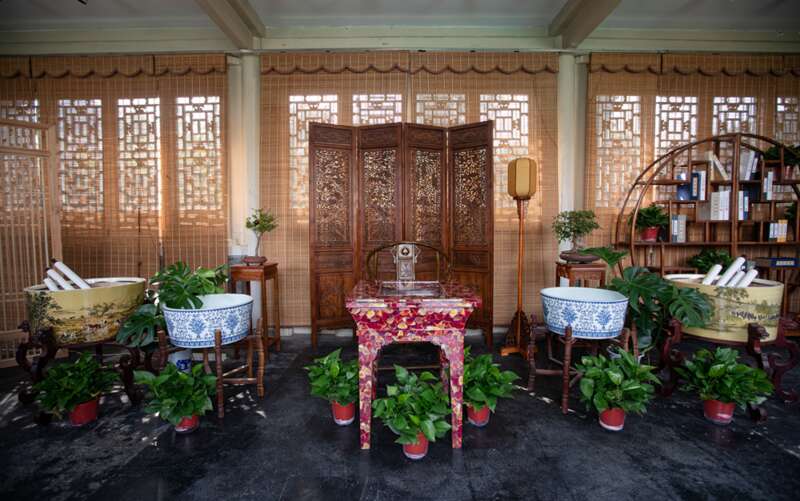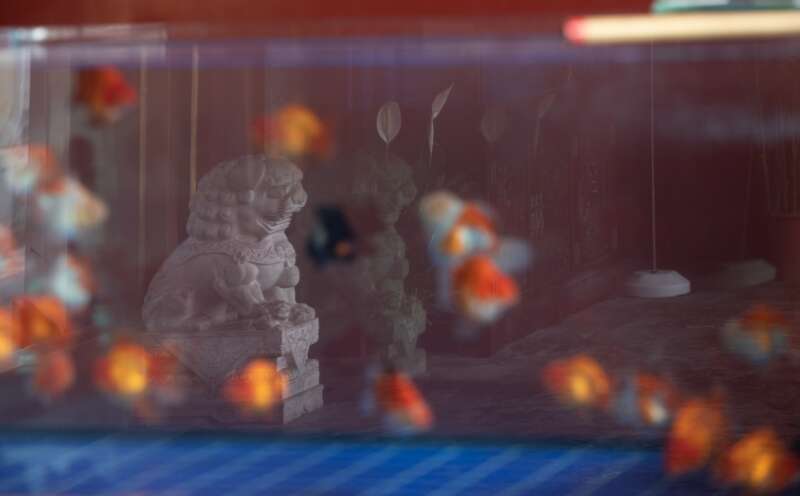 在恭王府东二区院落及北侧多福轩院落,陈设有数十件木海、泥盆等传统金鱼养殖器具,汇集50余种、600余尾宫廷金鱼。策展团队根据明清时期书房及会客厅陈设布置,将鱼盆、鱼潜等赏器与金鱼主题书画点缀其中,让观众感受古典观鱼雅趣。