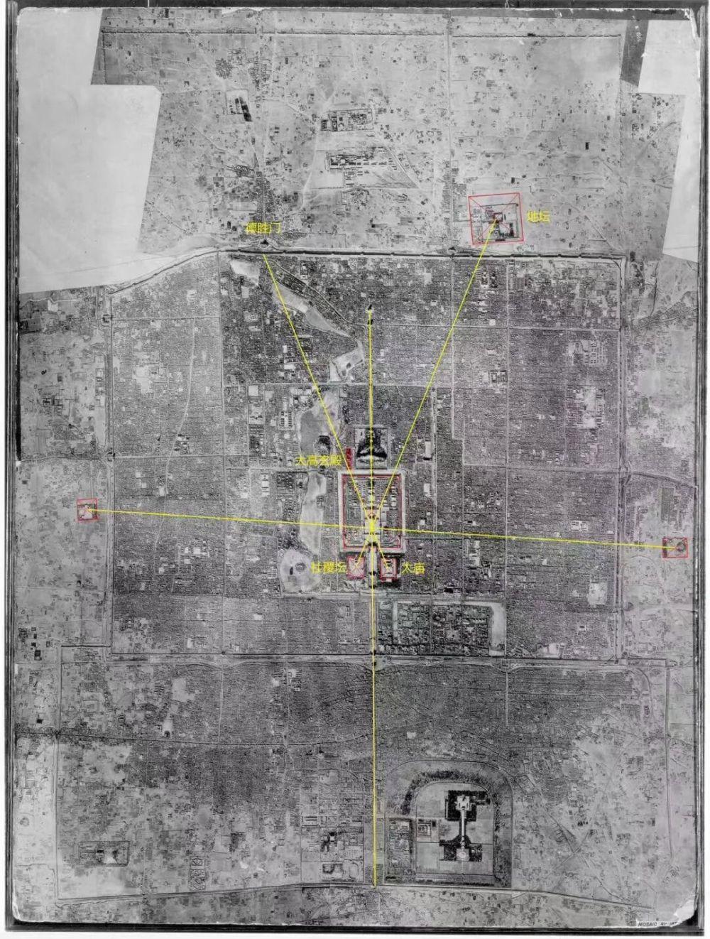 之后,他又通过航拍图及卫星影像确认分析,日坛平面几何中心与月坛平面几何中心的连接线,与城市的中轴线交会于太和殿前庭院,呈现子午、卯酉“二绳”交午格局。