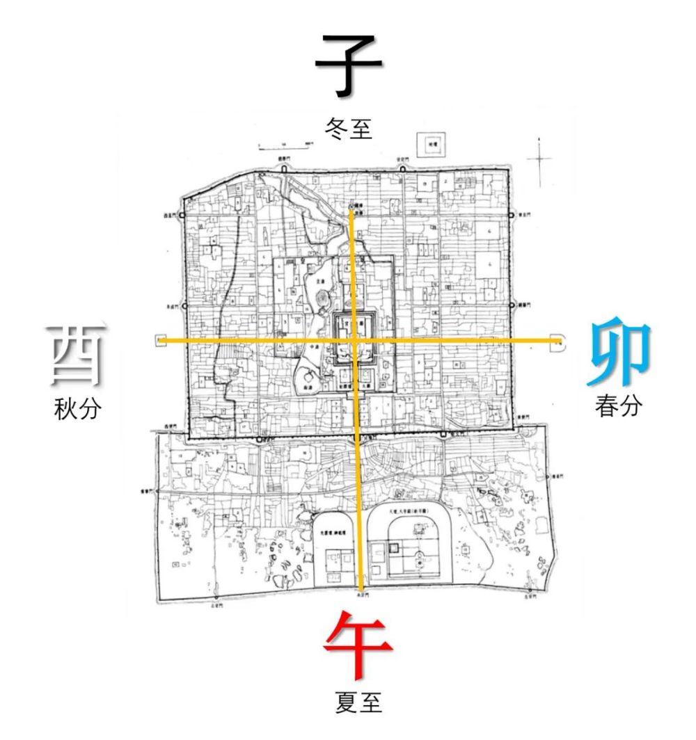 古人以天干、地支表示方位,称南北子午线、东西卯酉线为“二绳”。明清两朝,春分在日坛祭日,秋分在月坛祭月,冬至在天坛祭天,夏至在地坛祭地。日坛、月坛的连接线与南北中轴线显然取义“二绳”,其交会点在紫禁城三大殿区域,显然表示后者为“中”之所在。