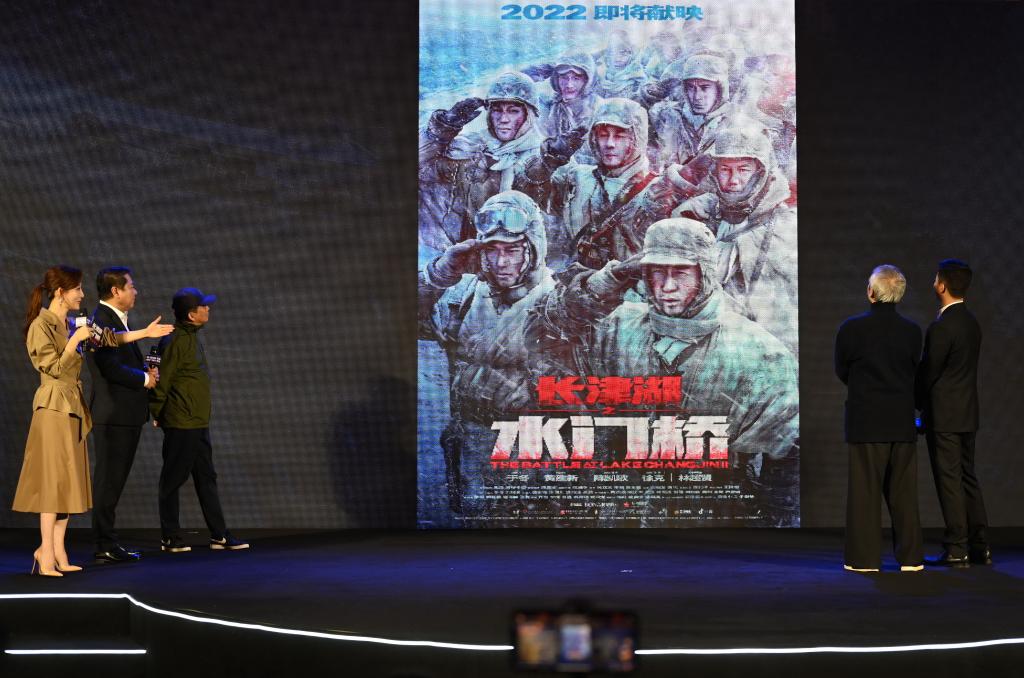 电影《长津湖之水门桥》2021年在厦门举行新闻发布会,黄建新(左三)为总监制。新华社记者 林善传 摄
