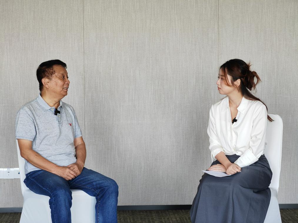 导演黄建新(左)接受记者专访。新华社记者 邓瑞璇 摄