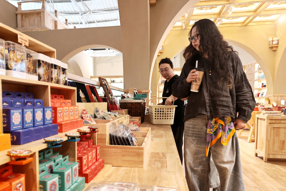 9月19日,范燕燕丝绸艺术中心店长李芳在整理文创产品。新华社记者 崔翰超 摄