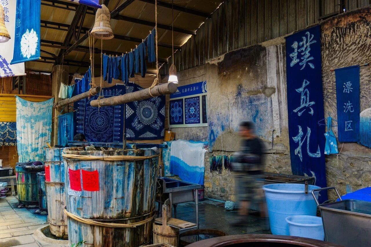 在大理市喜洲镇周城村,一位六十岁左右的女性扎染手艺人正在教游客染布技巧。院落中挂满了各具特色的扎染作品,从设计扎花到浸染拆线,扎染十六道工序承载着匠人对自然的敬畏:将苍山的板蓝根熬成靛蓝色,借洱海的风吹开染好的布匹,晾晒出独特光泽。