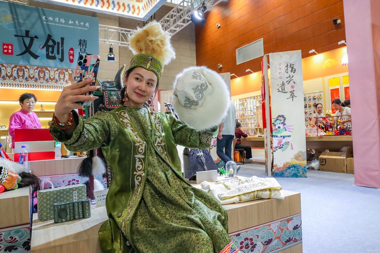 9月22日,游客在敦煌文博会上的一个展览现场身穿民族服饰自拍。新华社记者 郎兵兵 摄