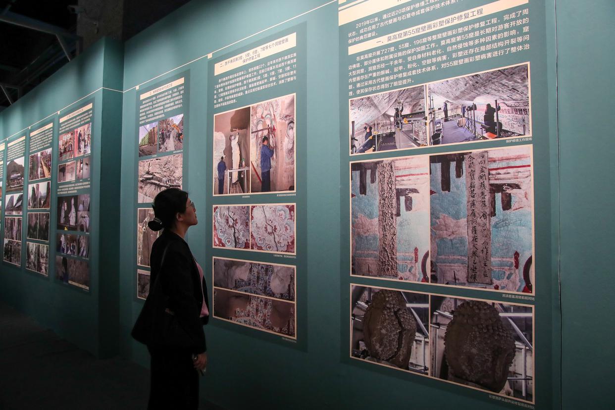 9月22日,在敦煌研究院“典范”“高地”建设成果展上,一名嘉宾在观看莫高窟壁画彩塑保护修复工程简介。新华社记者 郎兵兵 摄
