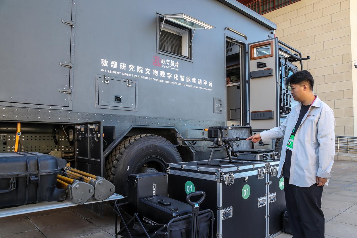 9月22日,在敦煌研究院“典范”“高地”建设成果展上,工作人员介绍敦煌研究院文物数字化智能移动平台及其配套设备。新华社记者 郎兵兵 摄