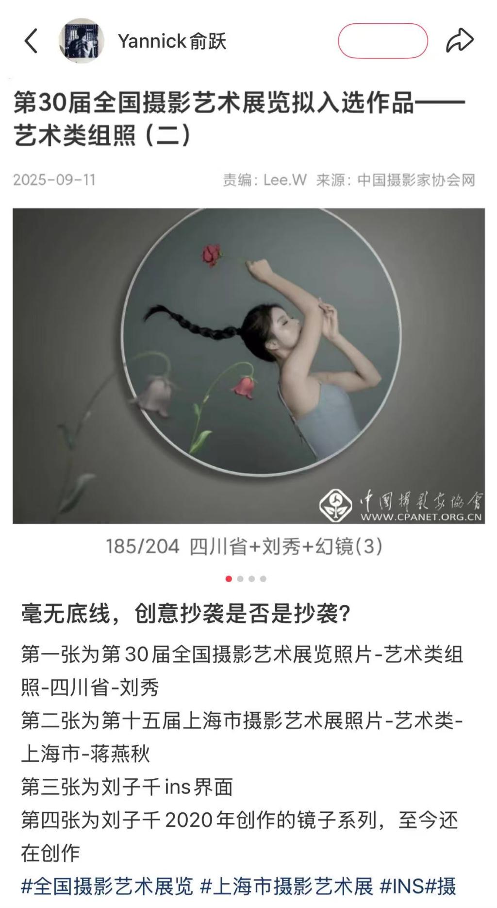 2025年9月2日,上海市摄影家协会微信公众号公布了“第十五届上海市摄影艺术展览”获奖名单,署名为蒋燕秋的艺术类作品《无相》入围。9月中旬,上海市摄影家协会接到实名举报,称《无相》与某网站摄影人发布的原创图像高度相似。上海市摄影家协会对此高度重视,经认真核查,确认蒋燕秋投稿的《无相》存在著作权争议,违反了第十五届上海市摄影艺术展览征稿“投稿规则”第六款:“参与投稿的作品,必须由作者本人独立完成,并对其拥有独立、完整、明确、无争议的著作权”。
