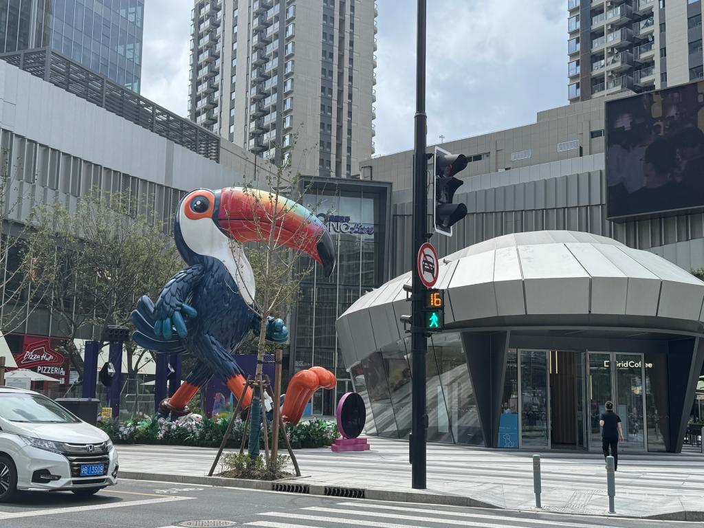 街区内随处可见巨型游戏IP雕塑装置。《蓝色星原:旅谣》的“菜鸡”、《剑与远征:启程》的“满满”、《绝区零》的“邦布”,还有原创IP巨嘴鸟“拓拓”等装置散布在街区各处,构成一道独特的风景线,尽显游戏世界的奇幻张力。