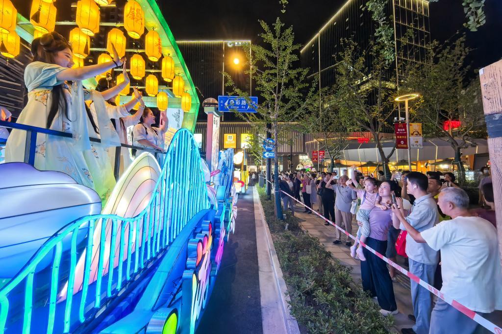 9月24日晚,人们聚集在“元界”街区,与花车上的演员互动。(受访单位供图)
