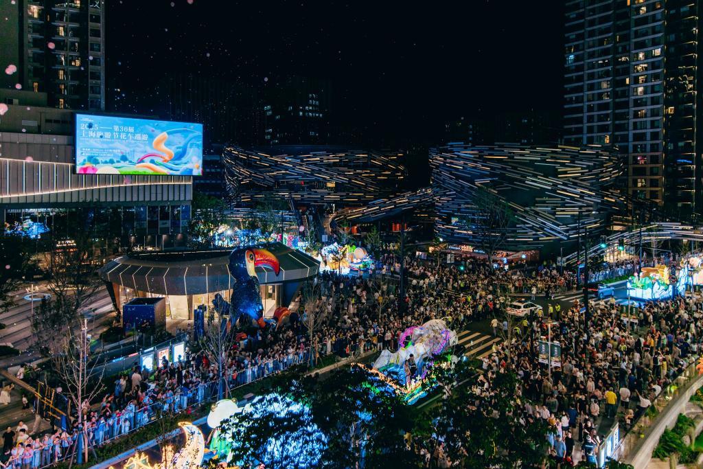 9月24日晚,人们聚集在“元界”街区观看花车表演。(受访单位供图)