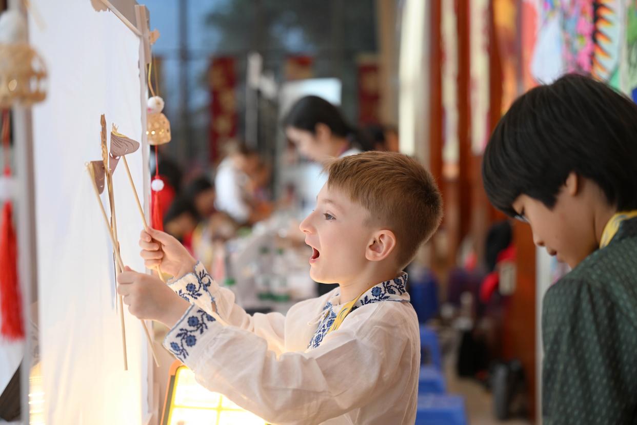 9月26日,小朋友在赛场外体验皮影戏。新华社记者 赵子硕 摄